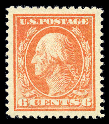 1911, 6¢ red orange (379), precisely centered within huge, perfectly balanced margins with bright, radiant color and pristine, never hinged original gum; an absolutely Superb Jumbo. SMQ $2,500 for a normal 98. Scott $80