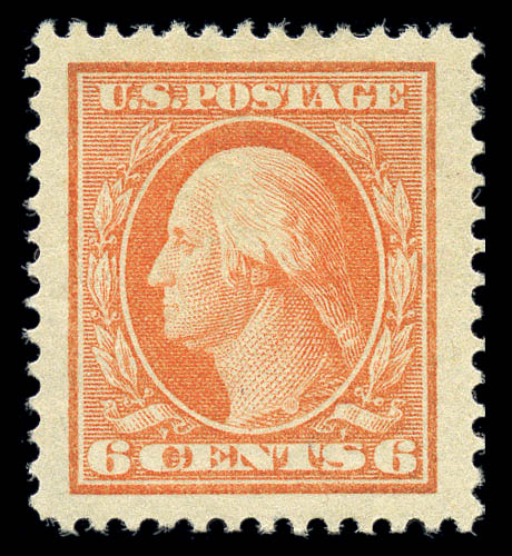 1911, 6¢ red orange (379), nearly perfectly centered with brilliant color and absolutely humongous margins, original gum, fresh and Extremely Fine. Scott $35