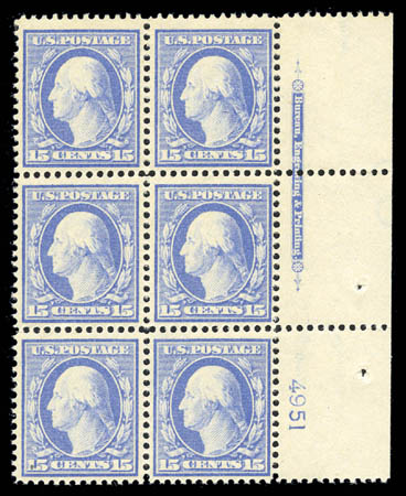1911, 15¢ pale ultramarine (382), right margin imprint and plate no. 4951 block of six, beautifully centered with brilliant color and crisp, intact perforations, original gum, never hinged, tiny natural perf dimple on back of upper left stamp, fresh and Very Fine. Scott $4,500