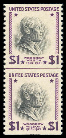1938, $1 Presidential, imperf horizontally (832a), vertical pair, exceptionally well centered for this scarce error, with bright fresh colors and paper, never hinged original gum, choice, Very Fine. Scott $1,500