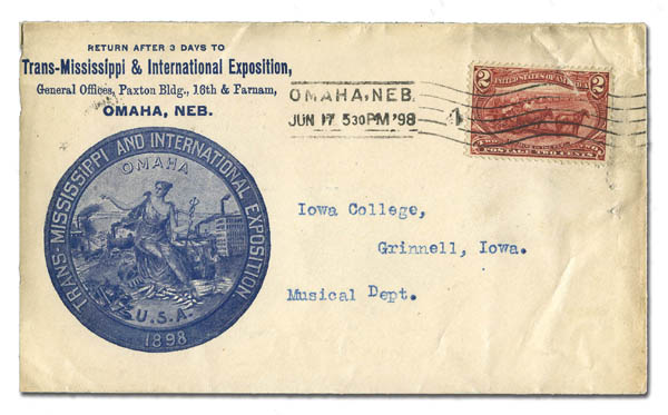 There are only two recorded Trans-Mississippi first day covers bearing an exposition cachet: 1. 1¢ with Official Seal cachet in light blue to The Legal Advisor in Chicago Ill. 2. 2¢ with Seated Liberty cachet in dark blue to Iowa College in Grinnell Iowa. The example offered here.