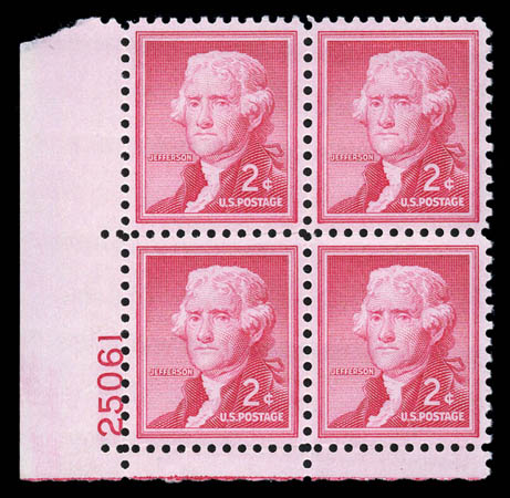 1954, 2¢ Jefferson, experimental Silkote paper (1033a), lower left plate number block of four, virtually perfectly centered, original gum, never hinged, Extremely Fine.