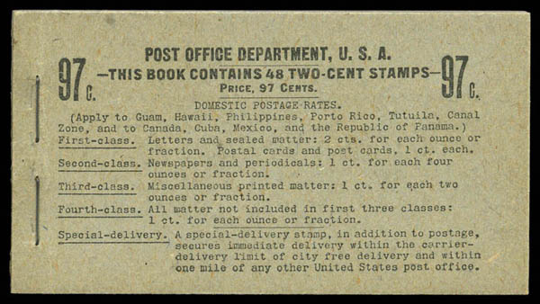 Booklet, 1903, 97¢, black on gray cover (BK17), complete and unexploded, containing eight panes of #319g, all position E, panes are F-VF, booklet is fresh and Very Fine with cover very lightly creased near staples (not mentioned on accompanying certificate). Scott $3,250