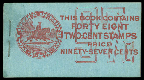 Booklet, 1916, 97¢, red on blue cover (BK52), complete and unexploded, containing eight panes of #463a, panes are Very Fine (4) or F-VF (4), booklet is lightly soiled and lightly bent near staples, otherwise F.-V.F. Scott $2,500