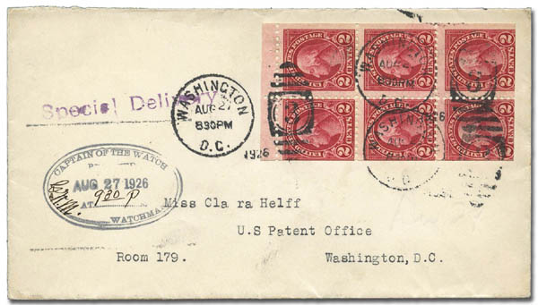 Booklet Pane, 1926, 2¢ carmine, rotary (583a), booklet pane of six with full tab, tied on First Day Cover by Aug 27, 1926 Washington D.C. duplexes, sent Special Delivery, and paying the correct 12¢ rate, to the U.S. Patent Office with a Captain of the Watch receiving stamp one hour after the 8:30 p.m. date of the postmark; pane is only average, centering-wise, but the cover is otherwise Very Fine and choice. A rare FDC.