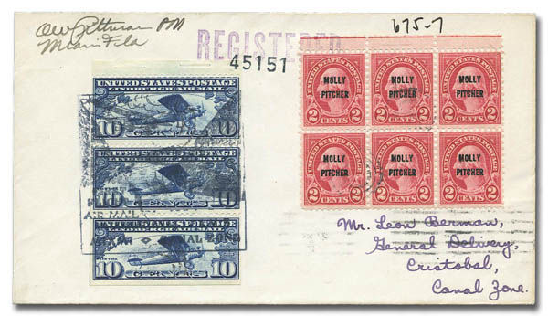 Airmail Booklet Pane, 1928, 10¢ Lindbergh (C10a), four covers, eached franked with a full pane (plus other postage): 1.) Miami-Crisobal first flight cover, Feb 1929 (flown by Lindbergh); 2.) Miami-Montevideo first flight cover, Jan 1930; 3.) 1930 Los Angeles-Lakehurst Zeppelin cover (legal size, open on three sides); and 4.) Cleveland Midwestern Phil. Sta. combination FDC with 2¢ Valley Forge (646); a Very Fine and scarce group for the Linbergh collector. Estimate $500 - 750