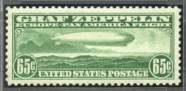 Airmail, 1930, 65¢ Graf Zeppelin (C13), perfectly centered within immense margins, bright fresh color and paper, original gum, never hinged, Extremely Fine. SMQ $1650 as a normal 98. Scott $375
