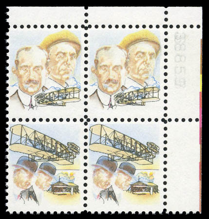 Airmail, 1978, 31¢ Wright Brothers, ultramarine & black omitted (C92b), upper right plate block of four, with just the barest trace of ultramarine on upper right stamp, well centered, never hinged original gum, Very Fine. Only 150 pairs (three plate blocks) have been reported. Estimate $500 - 750