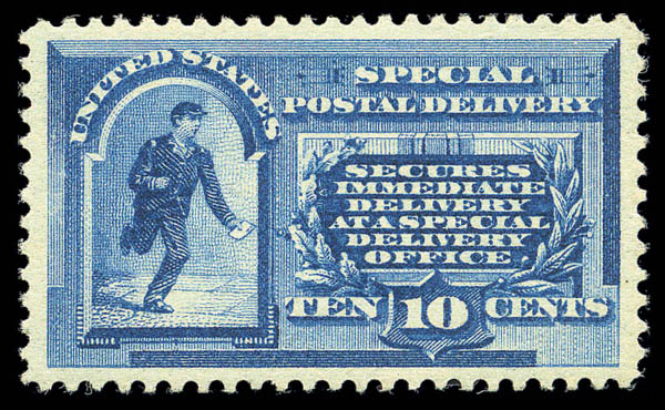 Special Delivery, 1885, 10¢ blue (E1), virtually perfectly centered within large margins, bright fresh color and paper, spotless never hinged original gum; an Extremely Fine to Superb gem. Scott $1,250
