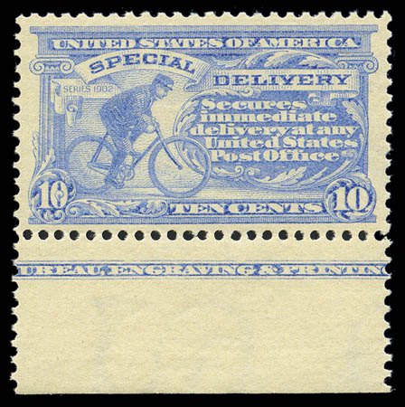 Special Delivery, 1902, 10¢ ultramarine (E6), bottom margin single with part imprint, well centered, lovely pastel shade, spotless never hinged original gum, Extremely Fine and choice. SMQ $1,600. Scott $525