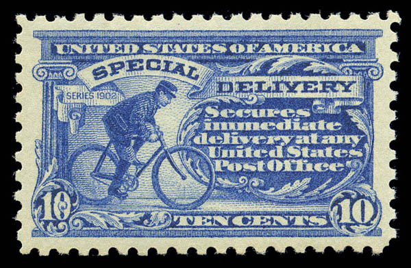 Special Delivery, 1914, 10¢ blue (E9a), choice, virtually perfect centering and truly exceptional color with post office fresh, never hinged original gum; a stunning, Extremely Fine gem. SMQ $890. Scott $550