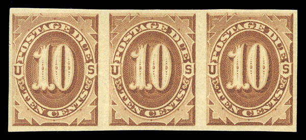 Postage Due, 1879, 10¢ brown, imperf (J5a), horizontal strip of three, large margins and deep, rich color, original gum, Very Fine and rare.