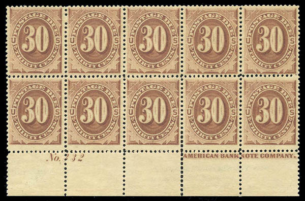 Postage Due, 1884, 30¢ red brown (J20), bottom margin imprint and plate no. block of ten, remarkably well centered with rich color and full, very lightly hinged original gum, choice Very Fine.