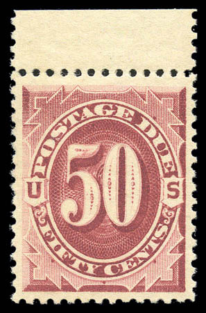 Postage Due, 1891, 50¢ bright claret (J28), top margin single, near perfect centering, absolutely stunning color, fresh never hinged original gum, Extremely Fine. Scott $2,000
