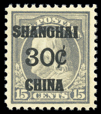 Offices in China, 1919, 30¢ on 15¢ gray (K12), fresh and nearly perfectly centered with large margins, original gum, never hinged, Extremely Fine. SMQ $1,200.