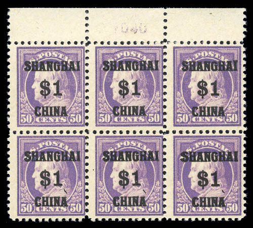 Offices in China, 1919, $1 on 50¢ light violet (K15), top plate number block of six, fresh, vibrant color with full never hinged original gum that was a bit unevenly applied, selvage somewhat reduced, Fine and exceedingly rare. Scott $17,500 for hinged