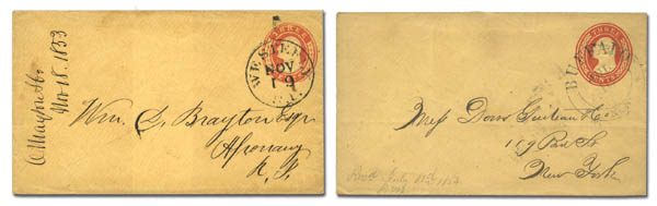 Envelope, 1853, 3¢ red on buff, dies 4 & 5 (U8, U10), two EDUs, first cancelled by clear strike of "Westerly R.I. Nov 19" c.d.s. and addressed to New York, endorsed "Mayton & Co., Nov 18. 1853", slight toing, Fine and scarce, with 2002 A.P.S. Certificate; second cancelled by "Buffalo N.Y. Jul 10" double-arc datestamp, addressed to New York City, pencil "Recd July 11th 1854" endorsement, torn flap, tiny repaired edge nick, Fine, with 2002 A.P.S. Certificate. Estimate $500 - 750