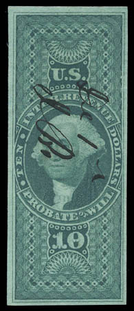 Revenue, 1862-71 First Issue, $10 Probate of Will, imperf (R96a), full to large margins, choice color and impression, neat manuscript cancel, Very Fine and fresh.