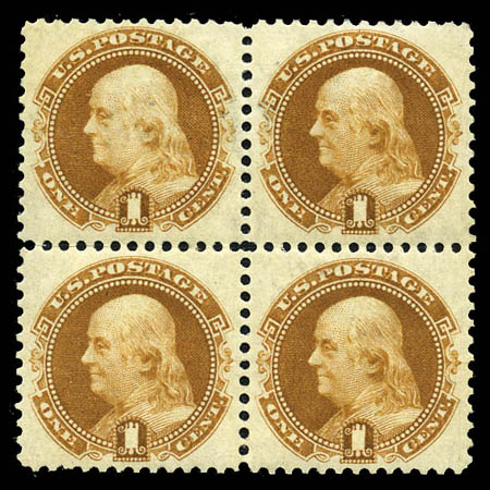 ONE OF THE FINEST OF THE FEW SURVIVING BLOCKS OF THE 1¢ 1875 RE-ISSUE.