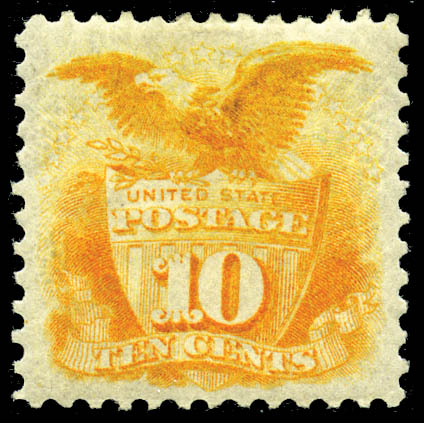 1869 (1875 Re-issue), 10¢ yellow (127), centered with near mathematical precision amid beautifully balanced margins with brilliant color and lightly hinged original gum; an Extremely Fine to Superb gem. Only 1947 issued. One of only six PSE 95s with just three graded higher; SMQ $6,300.