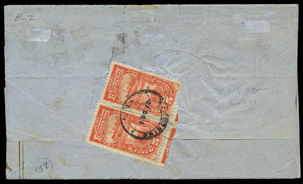 [To Peru] 1873, 6¢ dull pink (159), vertical pair, used with 5¢ (179) on FLS to Peru, all Fine and tied by crossroads cancels, blue company 8/31/76 DC handstamp, red "12" credit handstamp, magenta "San Francisco Paid All" 8/31 CDS, additionally franked on reverse with Peru 5¢ (J2) pair (torn upon opening, as usually seen), tied by 1876 Lima/Principal CDS, cover front separated from back, a very scarce combination cover, Very Fine. Estimate 150 - 200